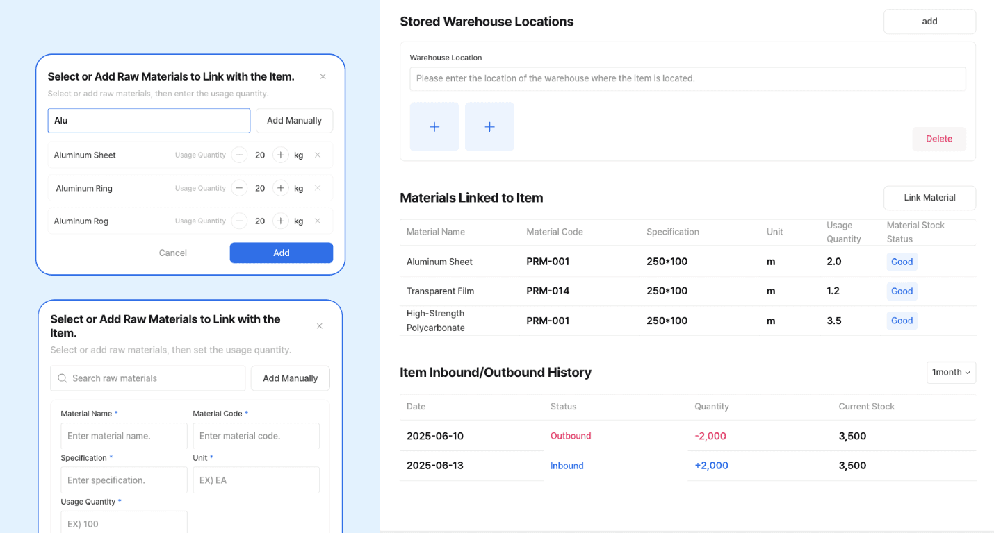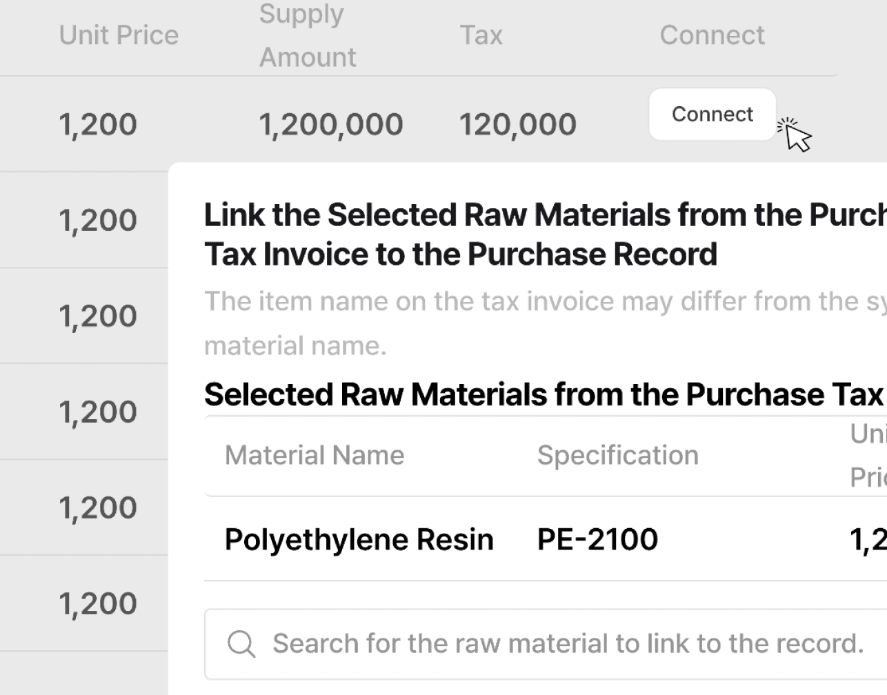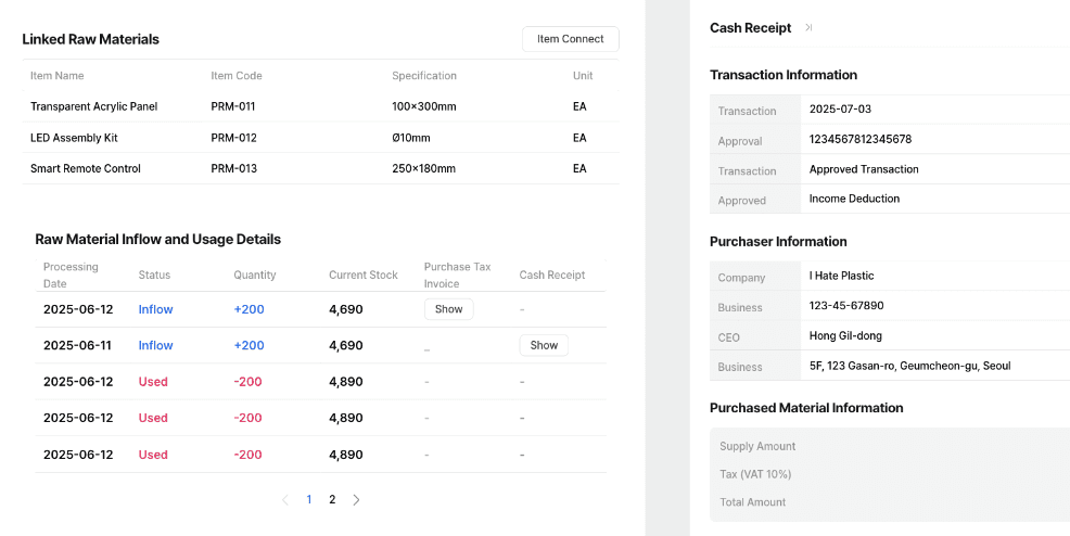 View purchase details and proof documents together in the material management screen to manage costs more transparently and effortlessly.