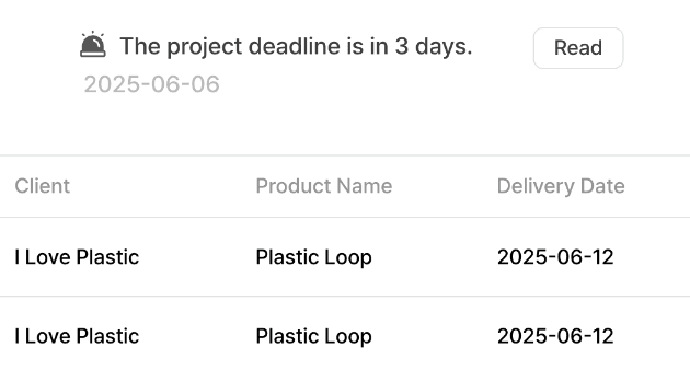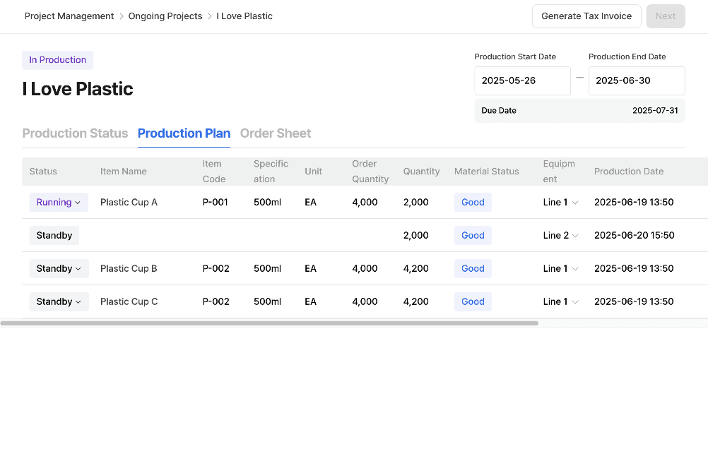 From quotation to production, delivery, and return — every step is managed in one seamless project flow.