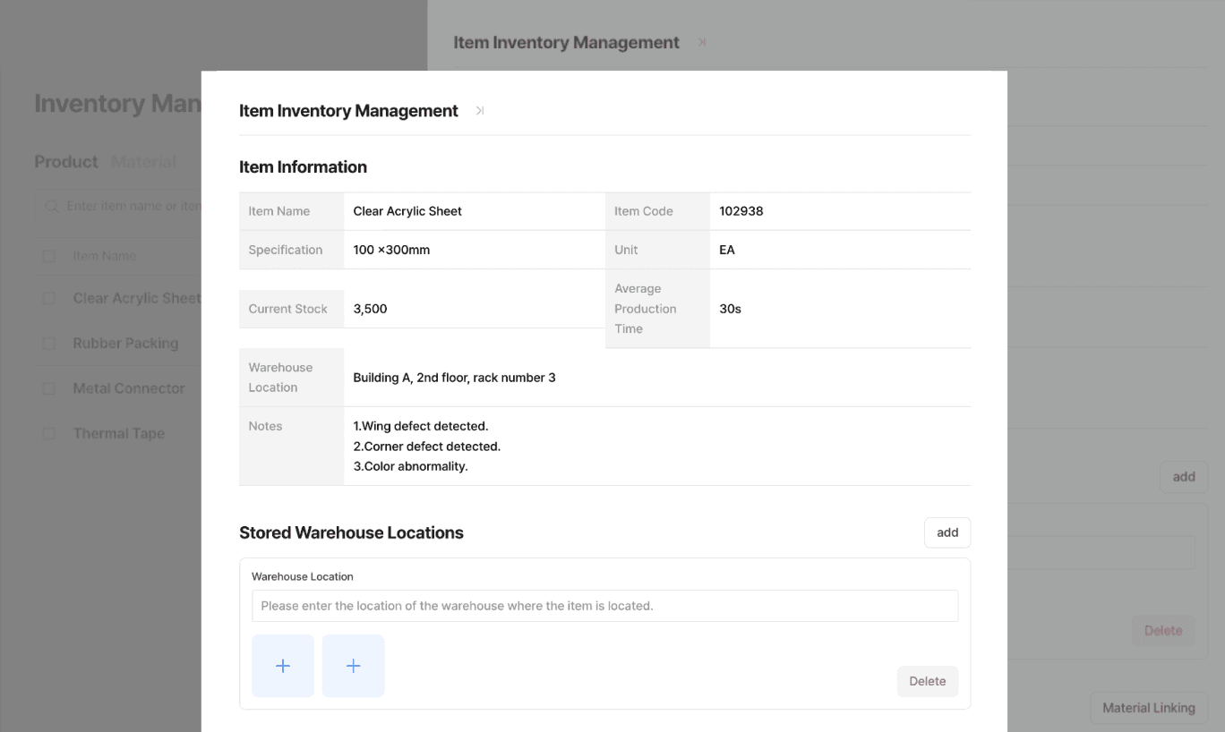 Record item and raw material details, current stock levels, and storage locations to ensure stable, loss-free inventory management.